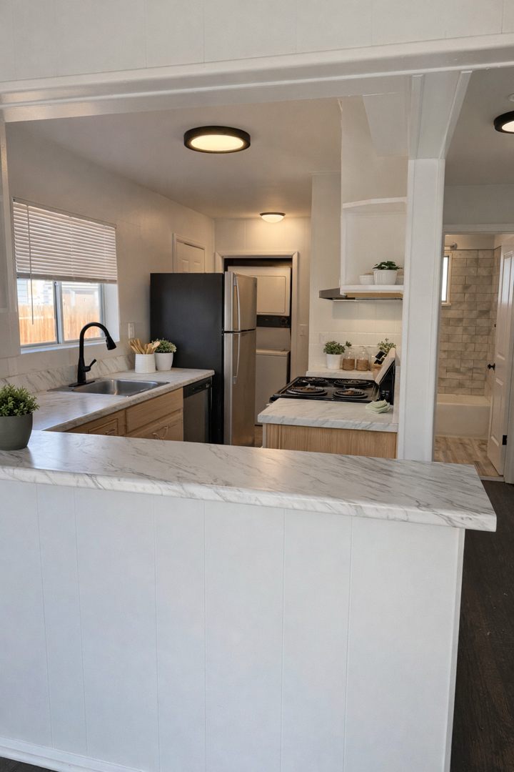 Kitchen: A brand-new kitchen equipped with stainless steel appliances, marble countertops, and ample cabinet space.